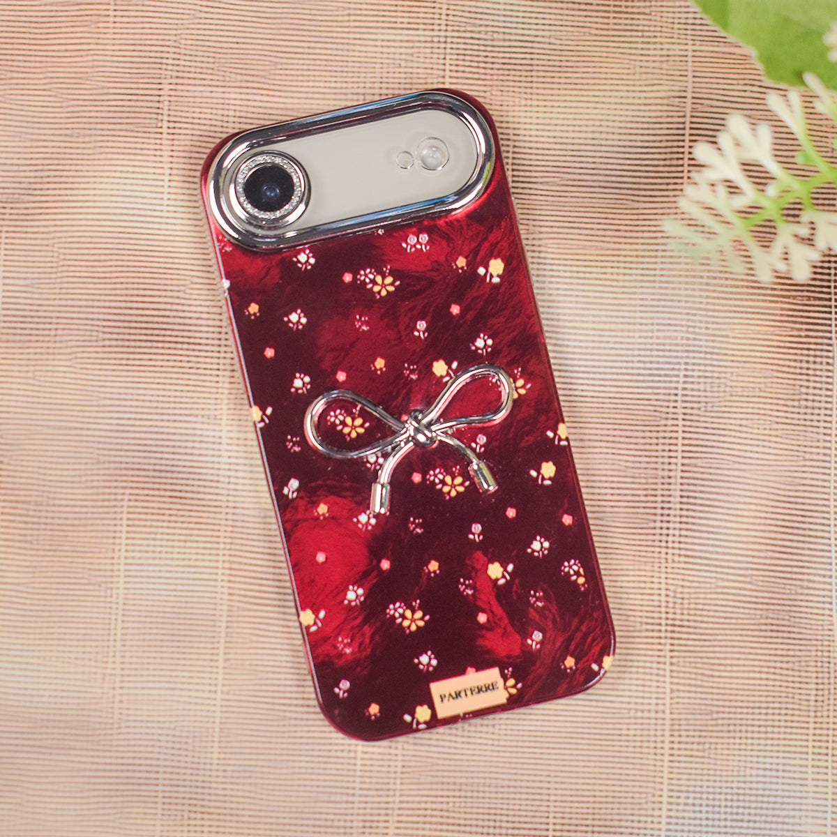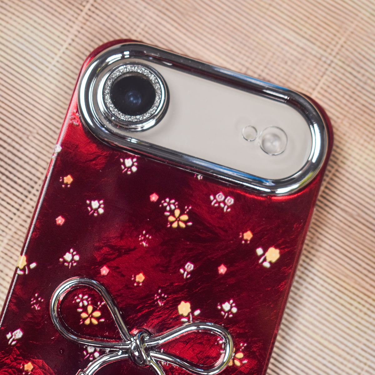 The Crimson Royale Bow Case is crafted for those who love their accessories bold yet elegant. Wrapped in a deep ruby-red glossy finish and scattered with delicate gold floral accents, this case captures the charm of festive luxury with a refined designer touch.